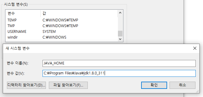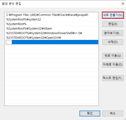 시스템 변수에서 새로 만들기 선택한다. (jdk 설치된 폴더 경로 설정)