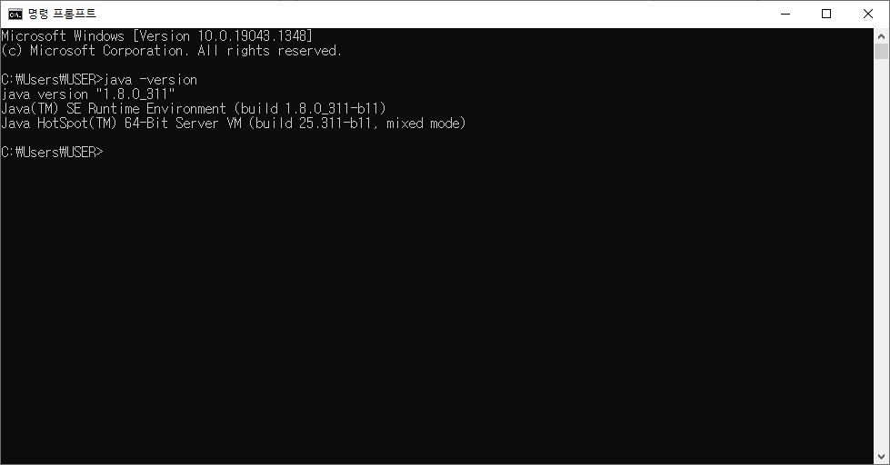 이후 CMD창을 열어 java -version 을 입력하면 아래와 같이 정상 설치된 것을 확인 할 수 있습니다.