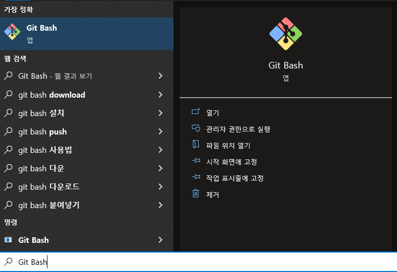 윈도우 시작 버튼 옆에 있는 돋보기 아이콘에 Git Bash 를 입력하고, 실행해봅니다.
