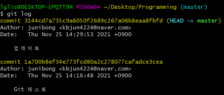 git logbash 창에 'git log' 명령어를 통해 지금까지 만든 커밋을 확인 할 수 있습니다.