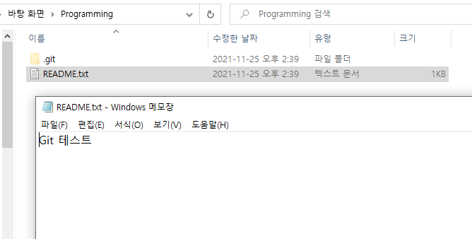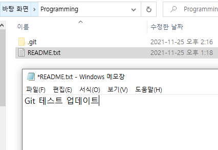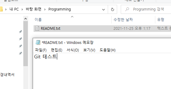 그리고 텍스트 파일을 열고, 'Git 테스트' 라고 적어주고 저장합니다.