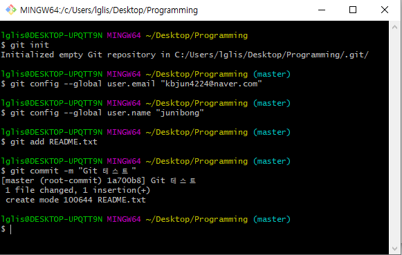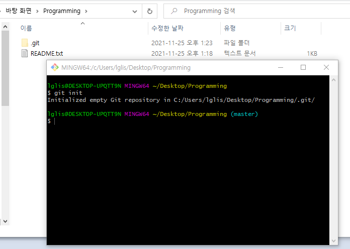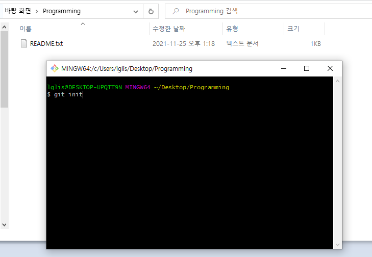 git init첫줄에 ~/Desktop/Programming 이 Git Bash 창이 실행되고 있는 경로를 보여줍니다.