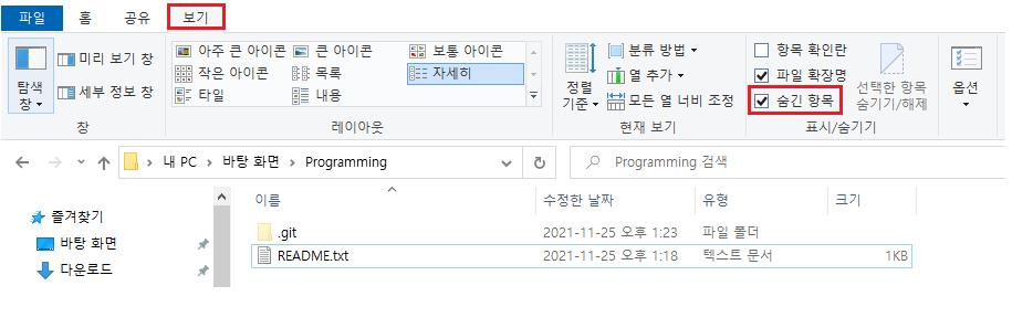[.git] 폴더는 파일 기본 속성이 '숨김'이어서 숨김 속성을 풀어줘야 보이게 됩니다.