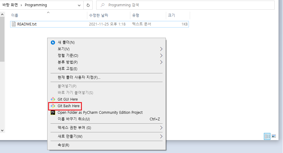Programming 폴더에서 오른쪽 버튼을 클릭 후 , 다시 [Git Bash Here]을 눌러 Bash 창을 열어줍니다.