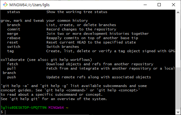 아래처럼 Git 기본 명령어가 대한 안내가 나오면 Git이 제대로 설치된 것입니다.