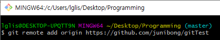 이제, Github 에서 만든 [gitTest] 원격저장소 주소를 내 컴퓨터 [Programming] 로컬저장소에 알려주고, 로컬저장소 커밋들을 원격저장소로 올릴 수 있습니다.