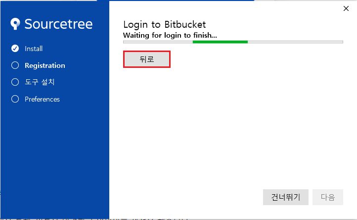 가입완료 후 아래처럼 자동으로 가입 완료가 인식되지 않는 경우 [뒤로] 버튼을 누르고 다시 [Bitbucket] 을 클릭합니다.