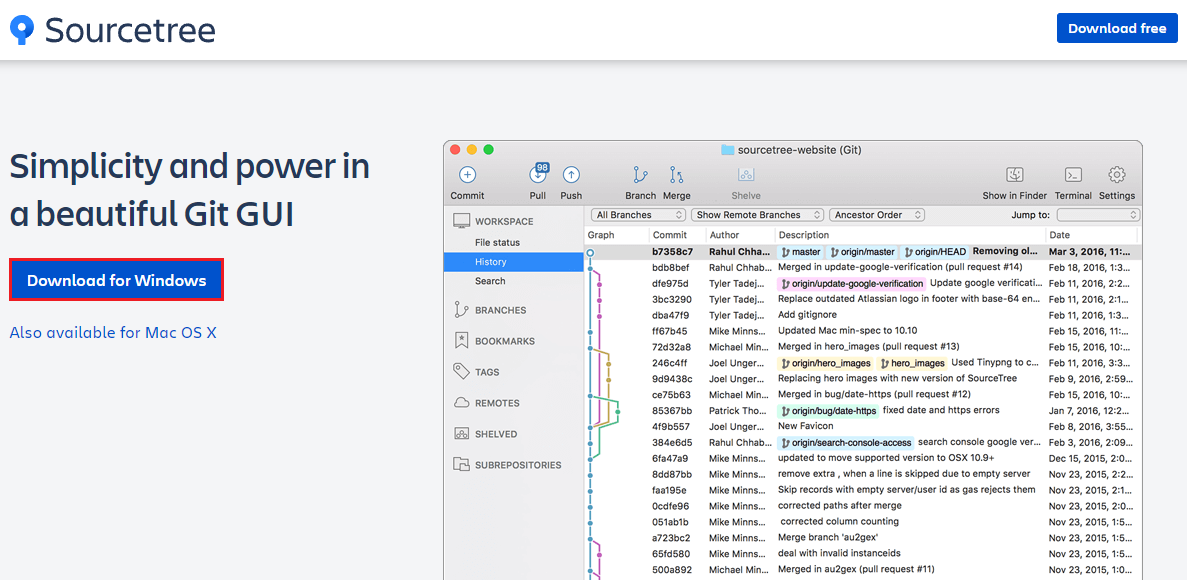 A Git GUI that offers a visual representation of your repositories. Sourcetree is a free Git client for Windows and Mac.