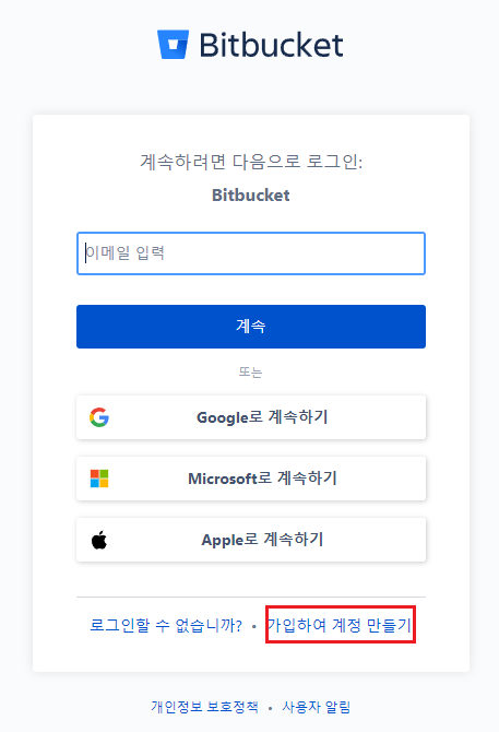 구글 계정으로 소셜 로그인하거나 이메일을 바로 입력할 수 있는 Bitbucket 으로 합니다.