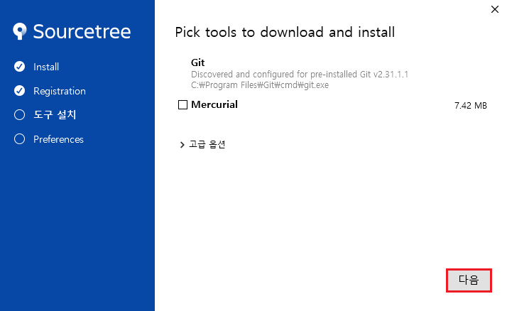 Git은 이미 설치되어 있으니, [Mercurial]은 체크 해제하고 다음을 누릅니다.