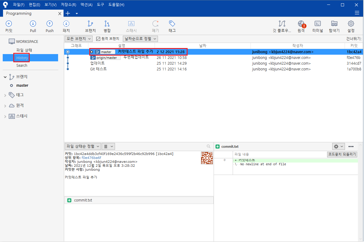 그리고 소스트리에서 History 화면을 새로고침 해봅니다.