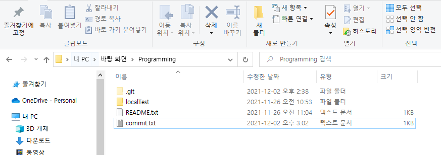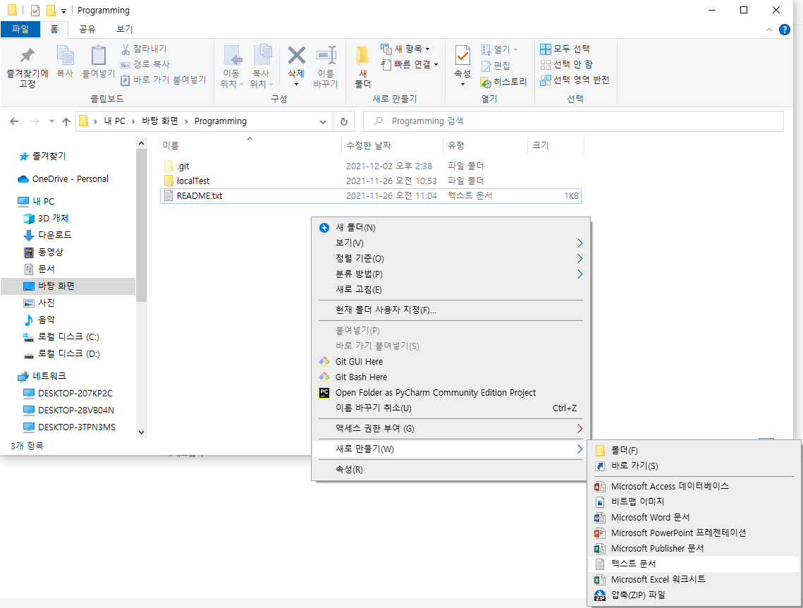 로컬저장소로 지정된 Programming 폴더에서 새로운 텍스트 파일을 만들겠습니다.