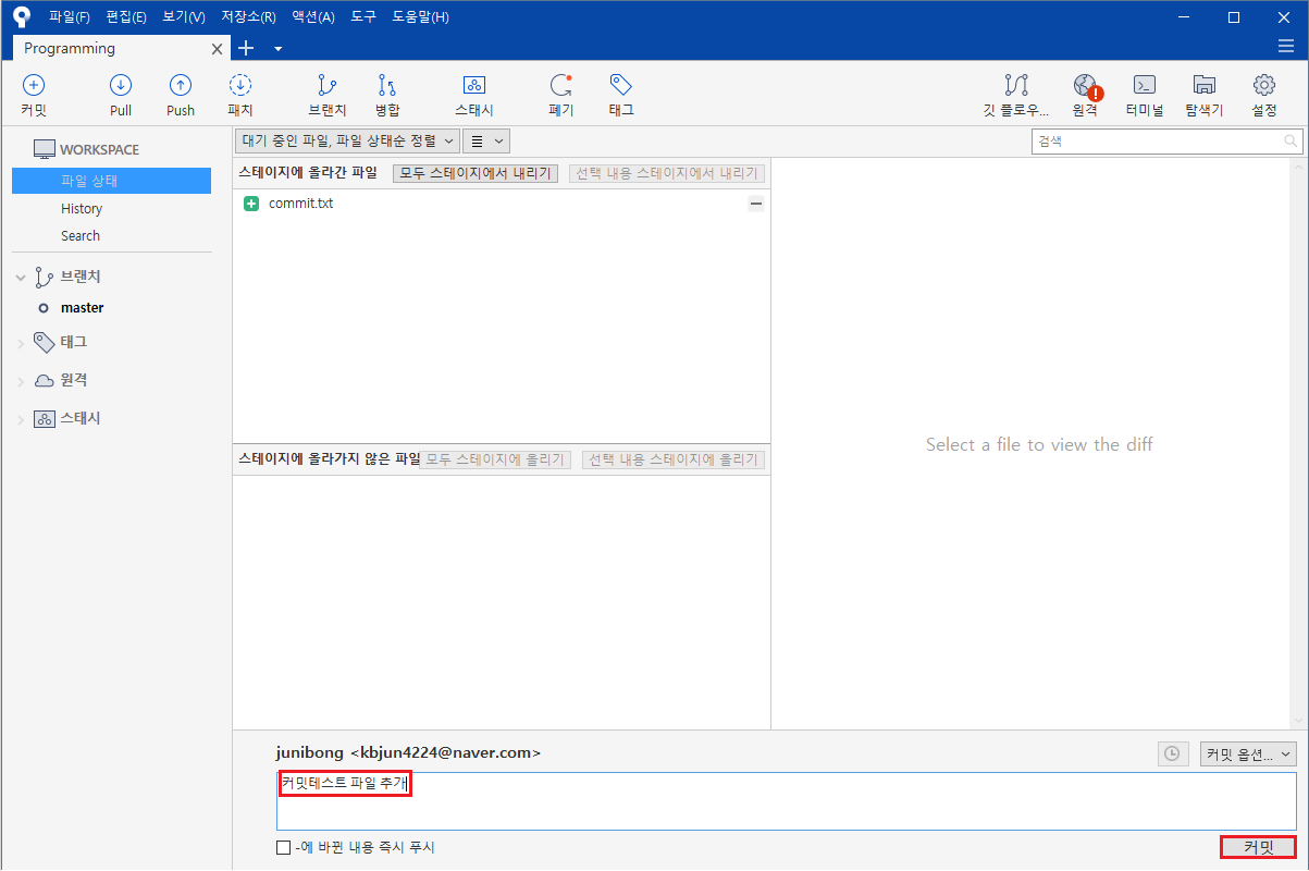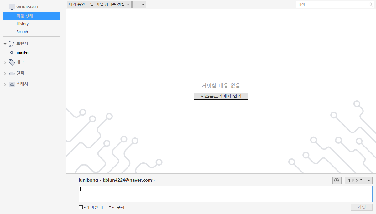 커밋이 완료되면 '커밋할 내용 없음' 으로 보여집니다.
