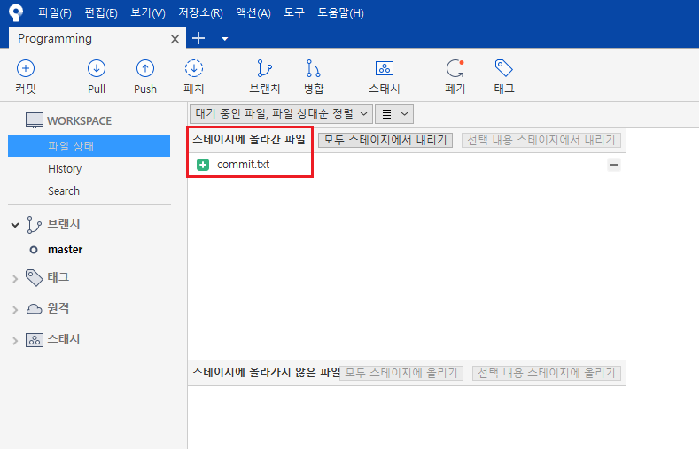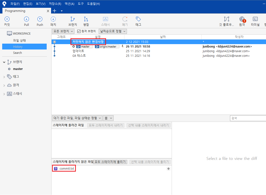 커밋하지 않은 변경사항이 보이고, 새로 만든 [commit.txt] 파일이 보이게 됩니다.