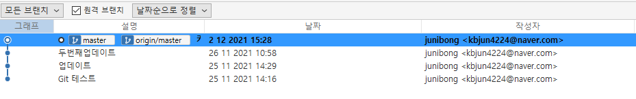 [Git] 소스 충돌로 인한 강제 pull 하기 (0) 2023.02.15 [Git] pull 과 fetch의 차이 (0) 2022.07.27 [Git] 6.로컬저장소를 소스트리에 불러오기 (0) 2021.12.02 [Git] 5.소스트리를 이용해서 Git 사용하기 (0) 2021.11.26 [Git] 4.Github 원격저장소의 커밋을 로컬저장소에 내려받기 (0) 2021.11.26 다음글이 없습니다.이전글이 없습니다.댓글