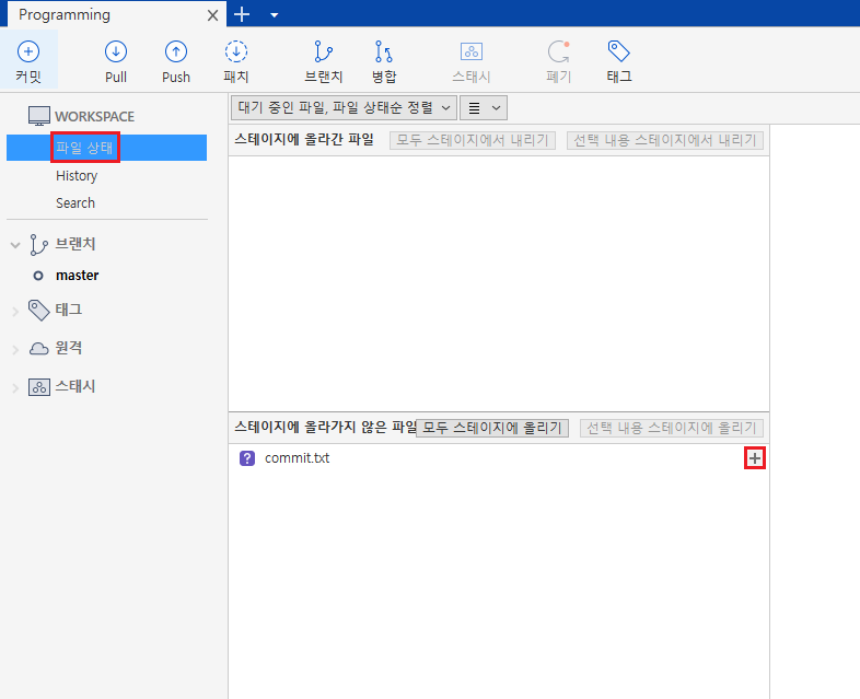 파일 상태화면으로 가서, 파일 옆에 [+] 버튼을 누릅니다.