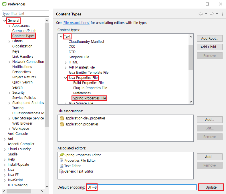 2) General -> Content Types -> Text -> Java Properties File -> Spring Properties File 에 설정합니다.