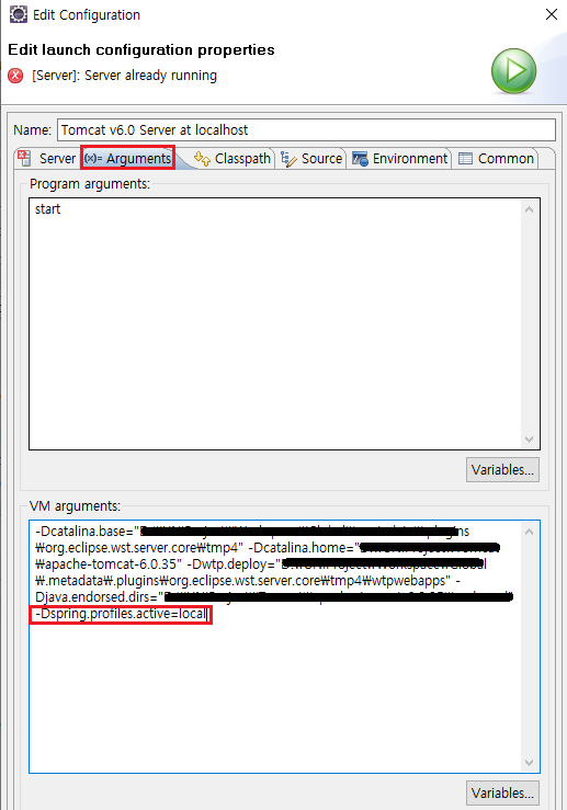 Arguments 탭에 VM arguments 에 아래의 내용을 추가해줍니다.