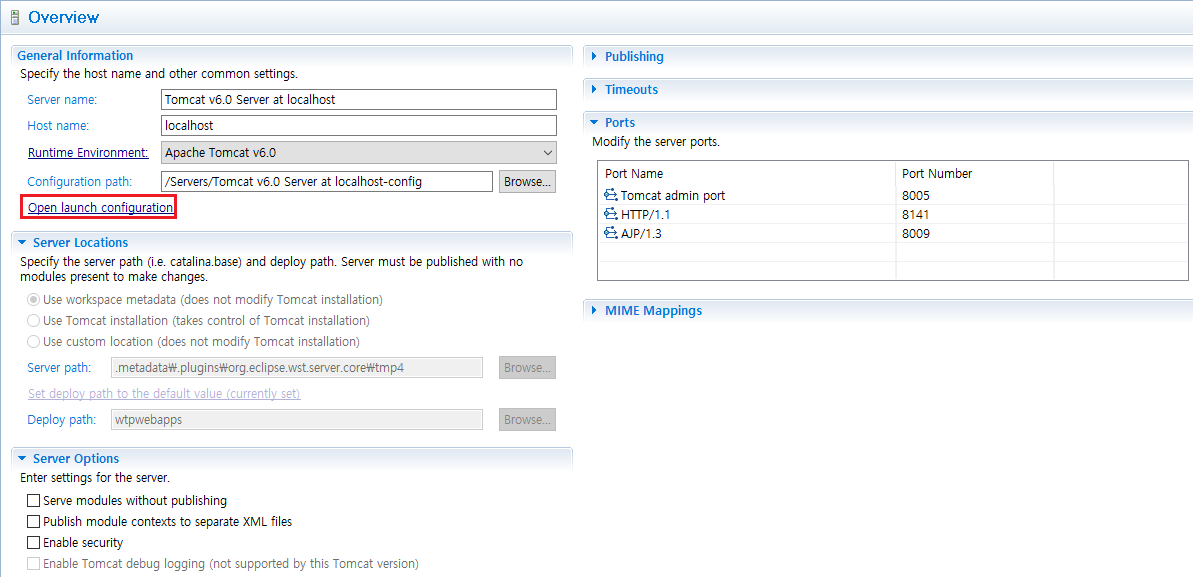 톰캣을 더블클릭 하여, 아래의 화면을 확인합니다.
