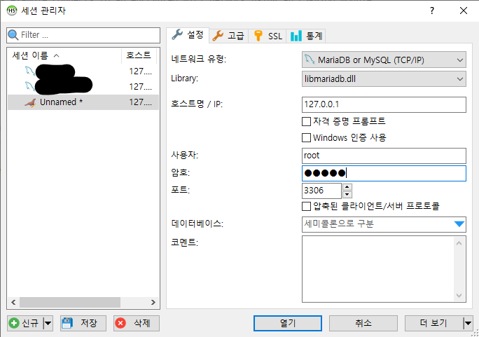 heidiSQL을 실행 후 로컬 접속을 해본다.