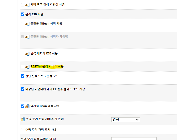 아래와 같이 RESTful 관리 서비스 사용을 체크해제 하면된다.
