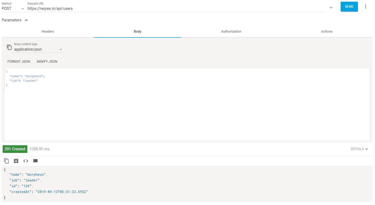 POST 방식 - 201 응답이 떨어져 제대로 테스트가 진행되었는지 확인이 가능하다.