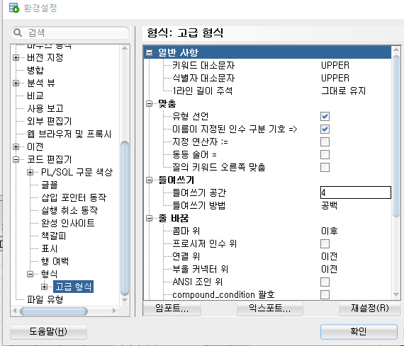 도구 -> 설정 -> 코드 편집기 -> 형식 -> 고급 형식 에 보면