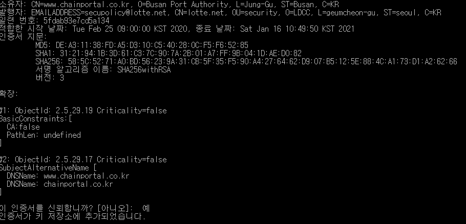 keytool -importcert -keystore "%JAVA_HOME%/jre/lib/security/cacerts" -storepass changeit -file output.cert -alias www.chainportal.co.kr 예 엔터키 하면 아래와 같이 저장된다.